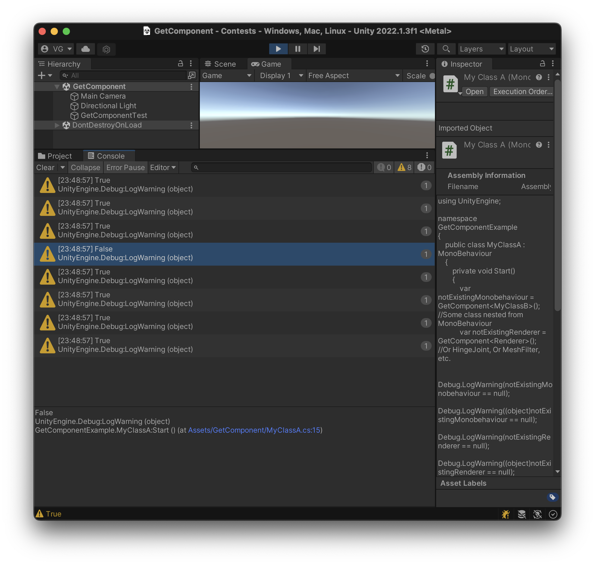 Now, let’s attempt to call GetComponent<MyClassB>() and GetComponent<Renderer>() from within the MonoBehaviour MyClassA. It looks something like this: