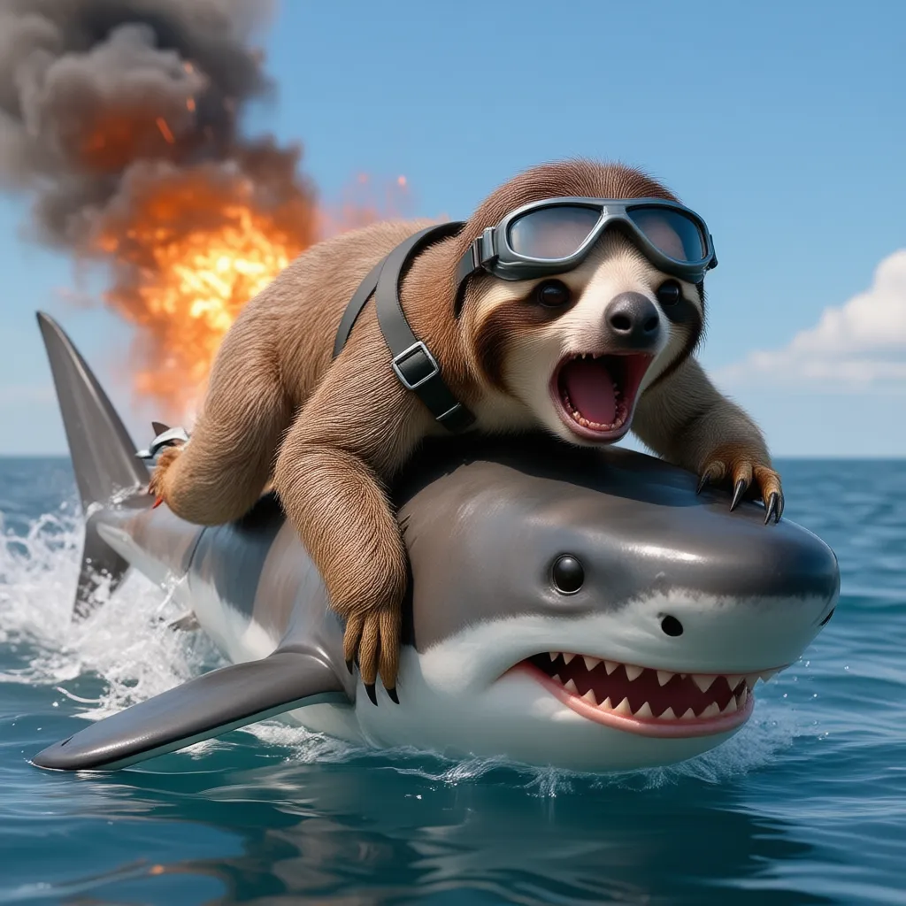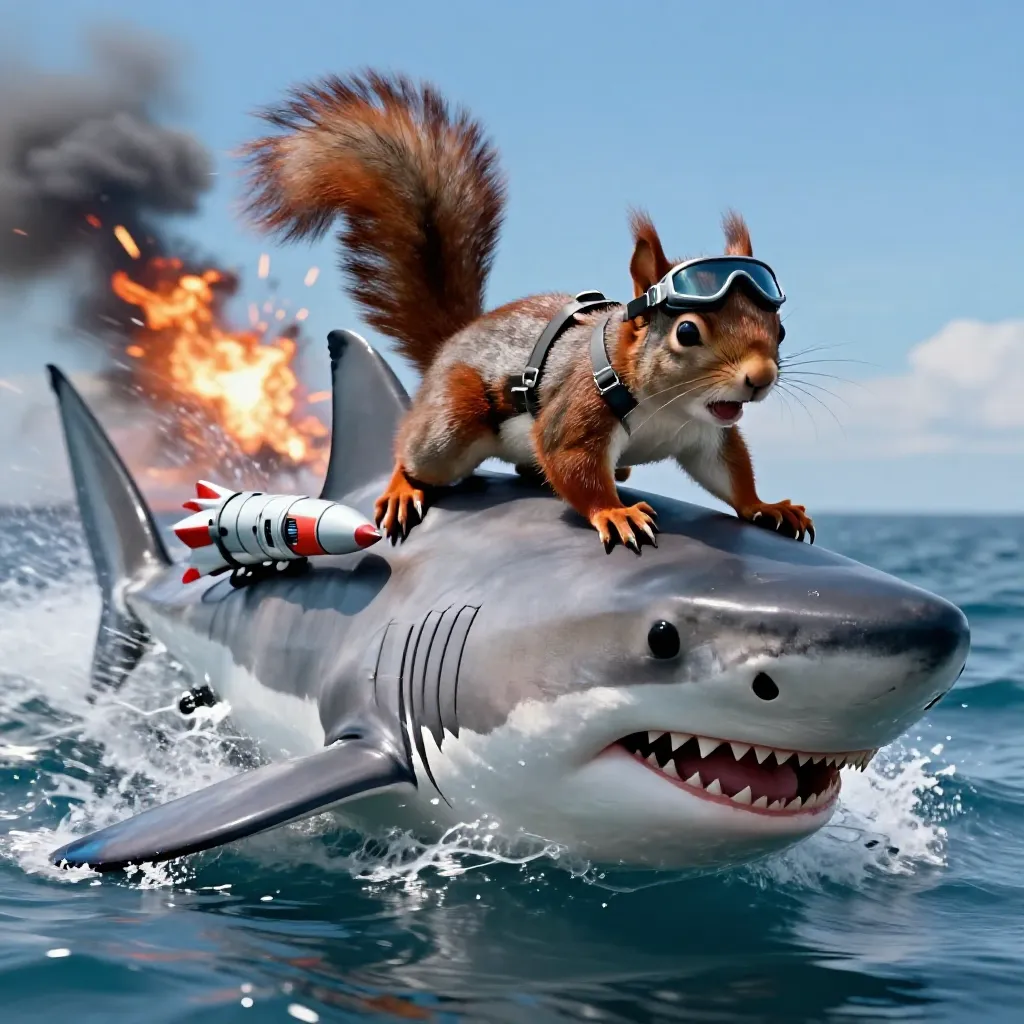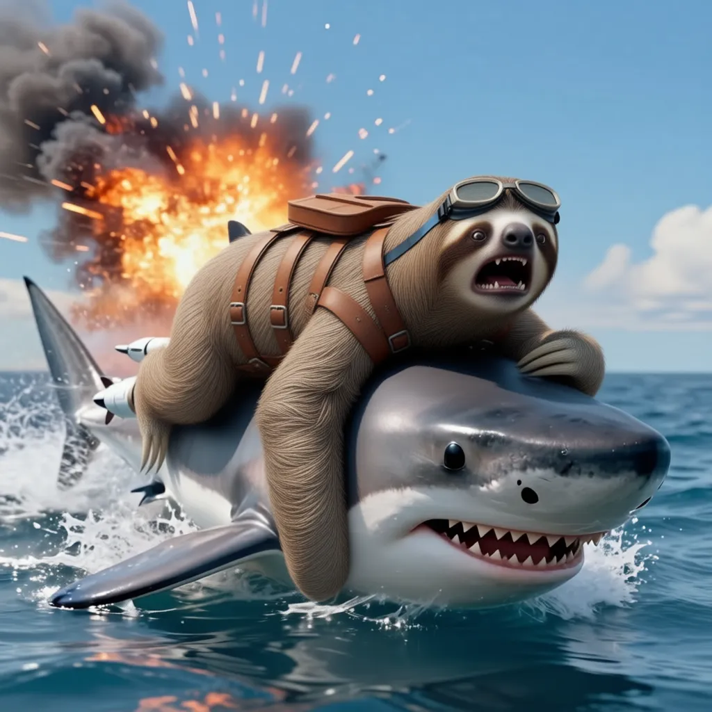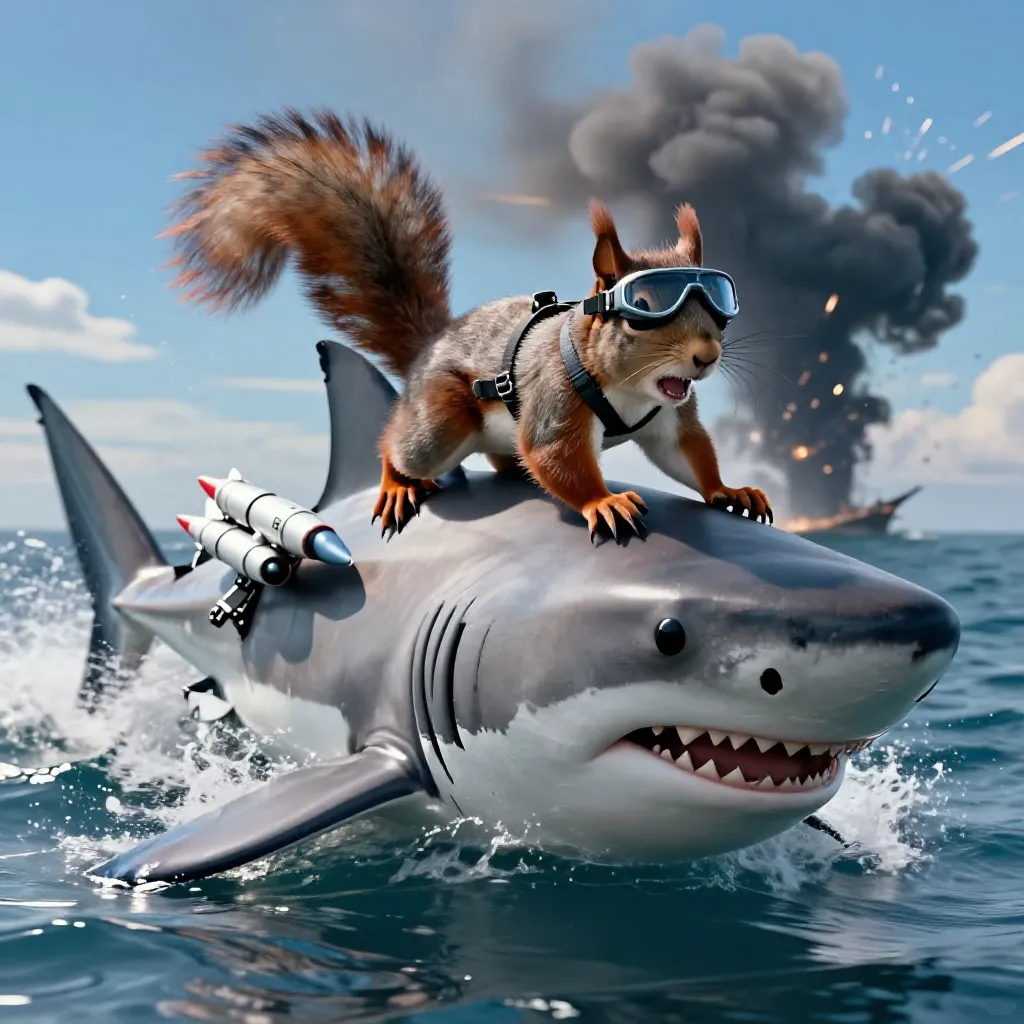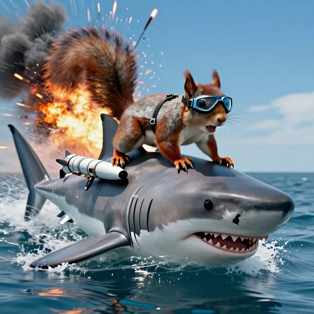 (reddish-colored fur:1.25) riding on the back of a fast-moving massive shark.