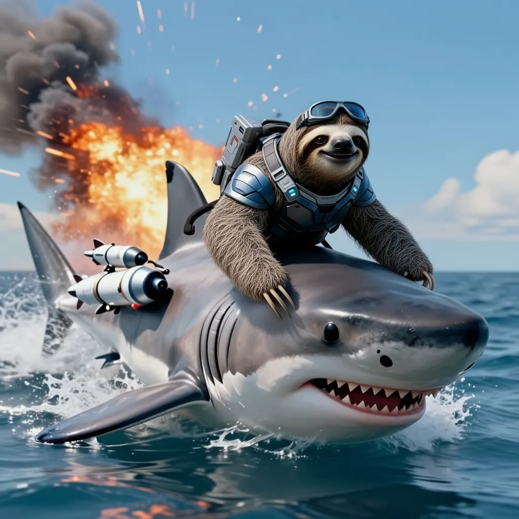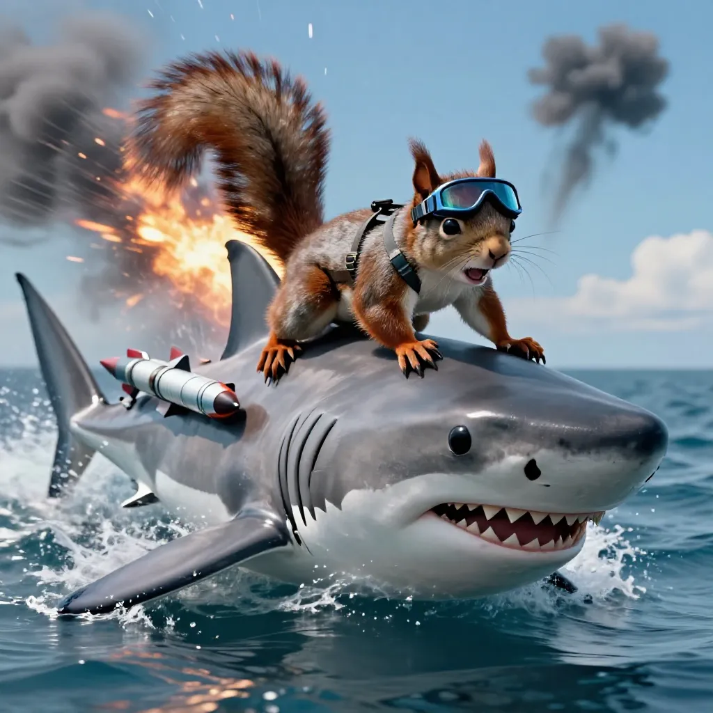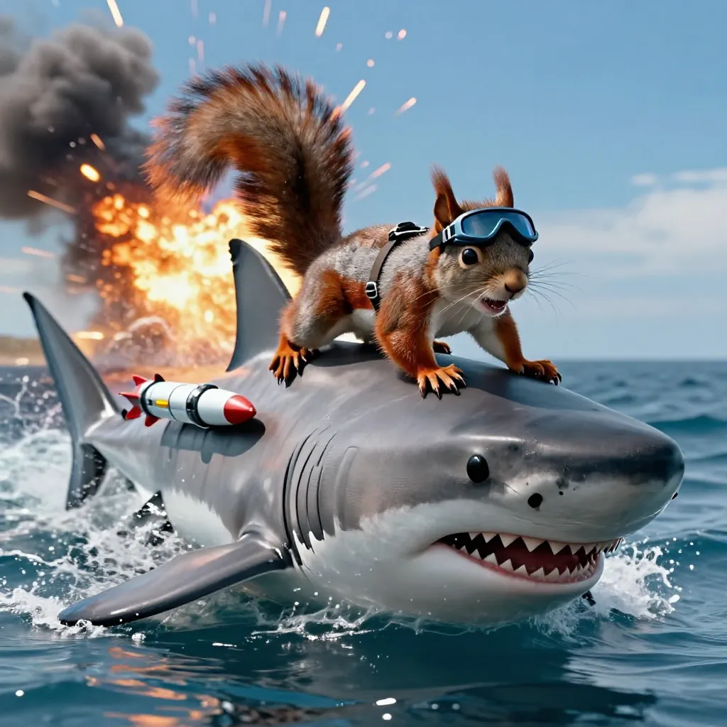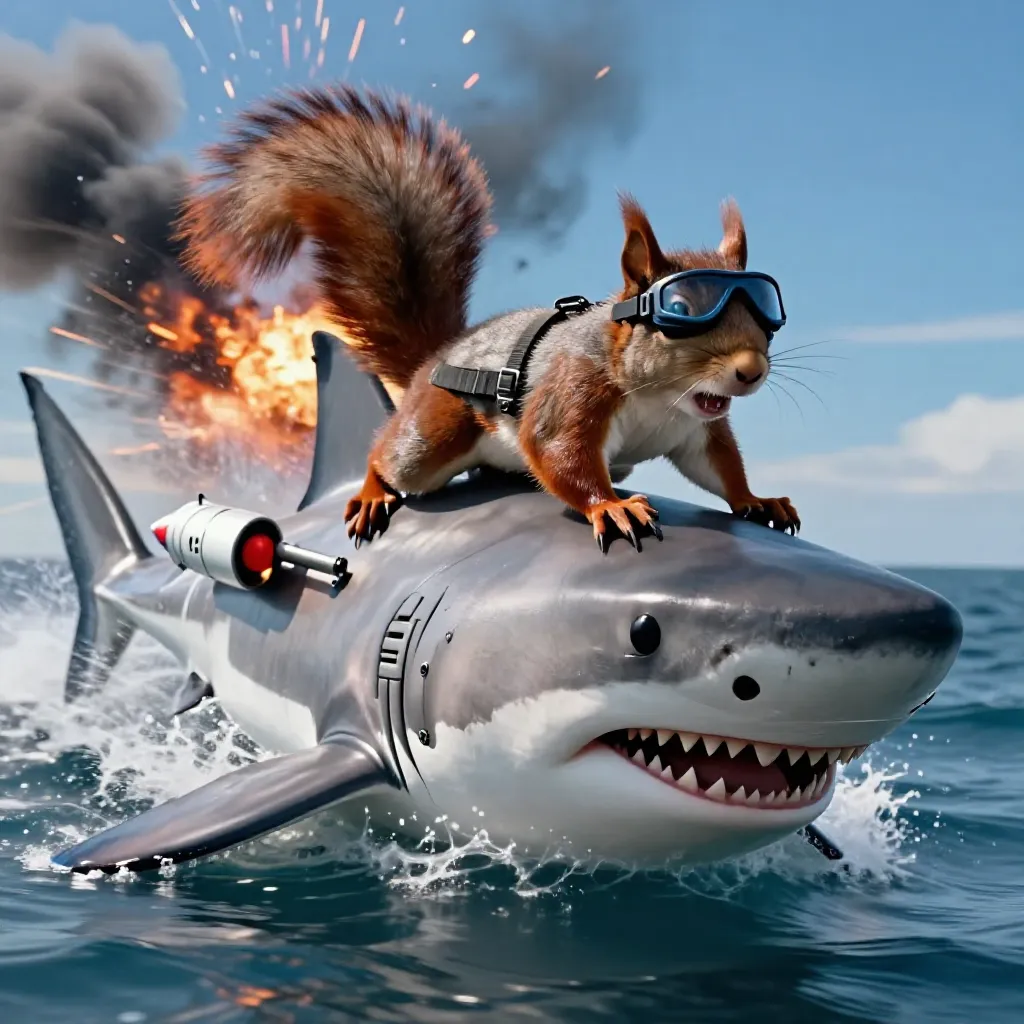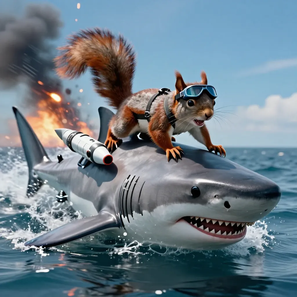 (reddish-colored fur:1.25) riding on the back of a fast-moving massive shark.