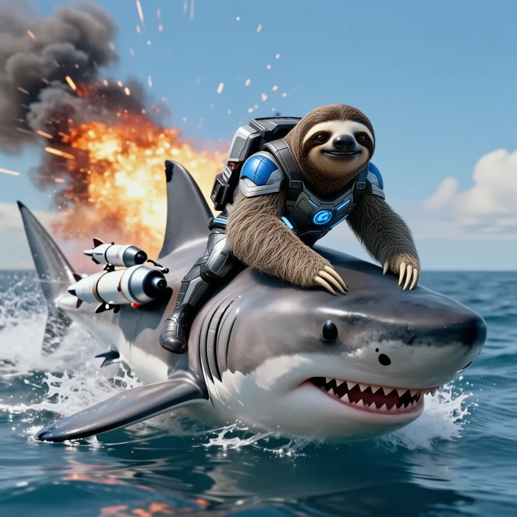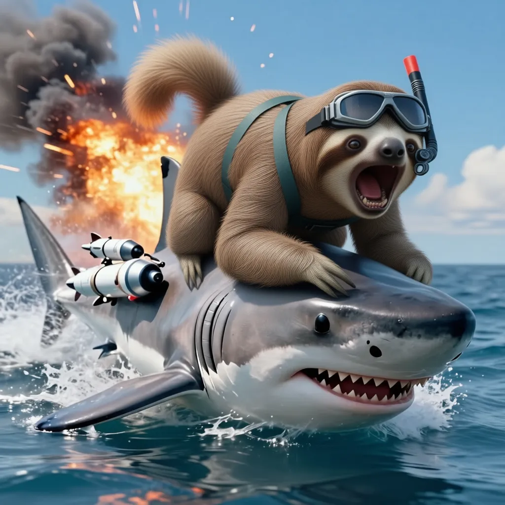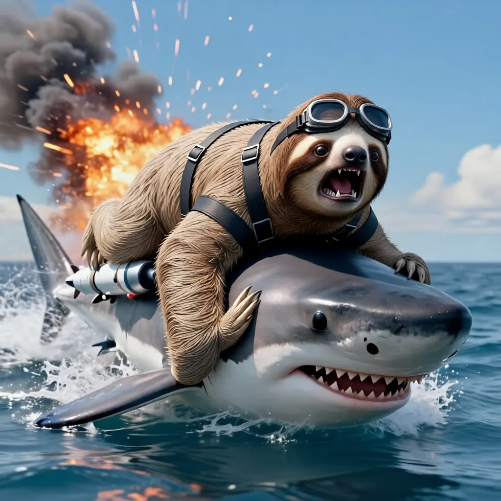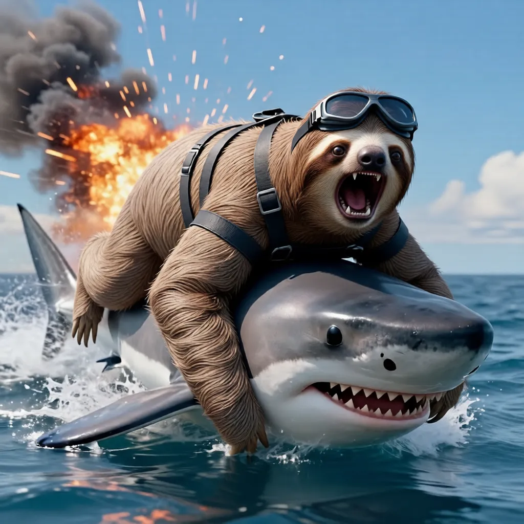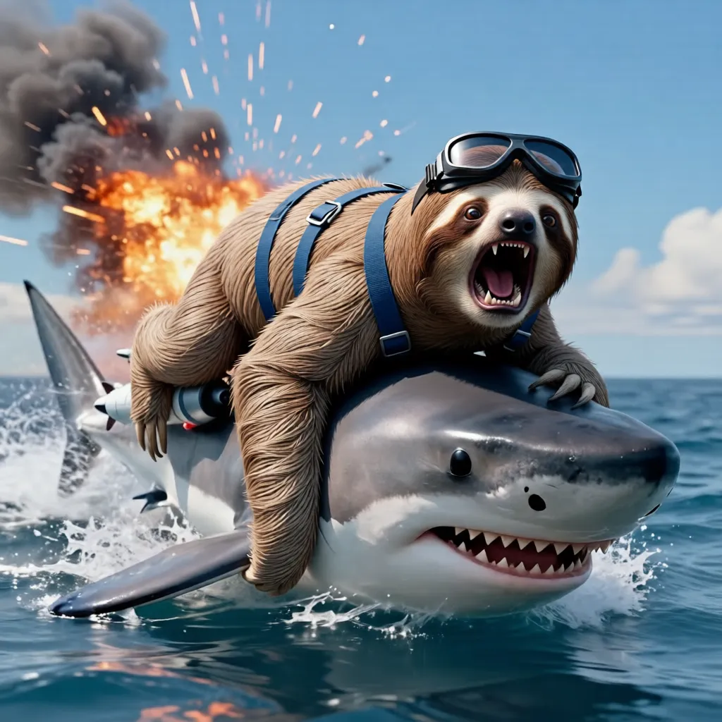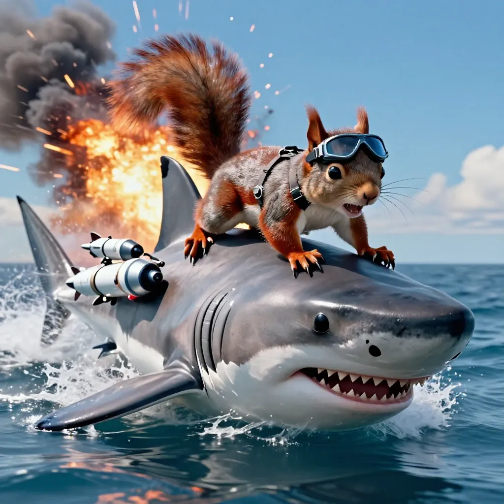(reddish-colored fur:1.25) riding on the back of a fast-moving massive shark.