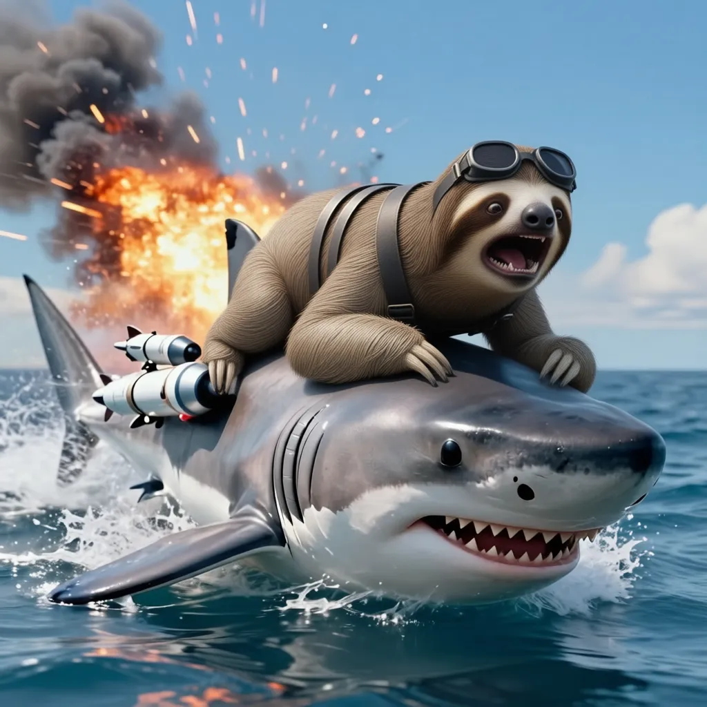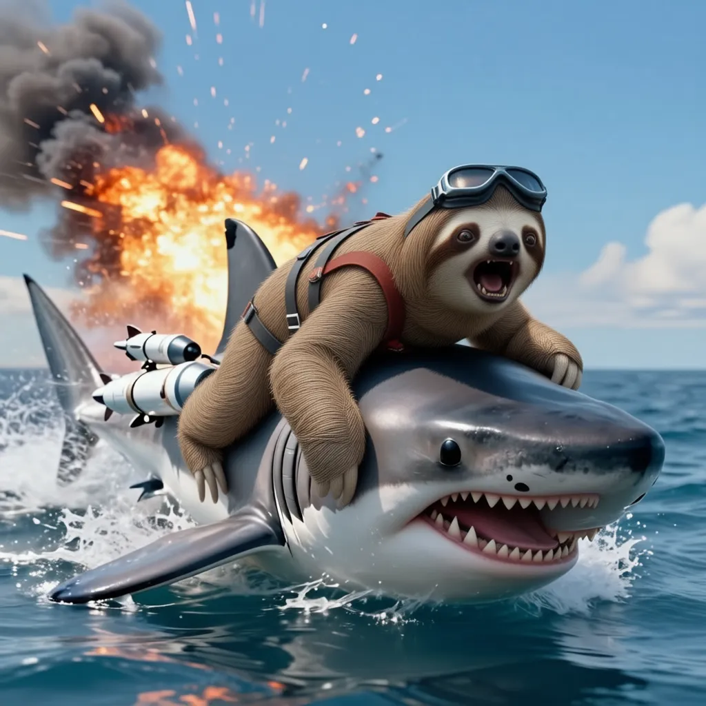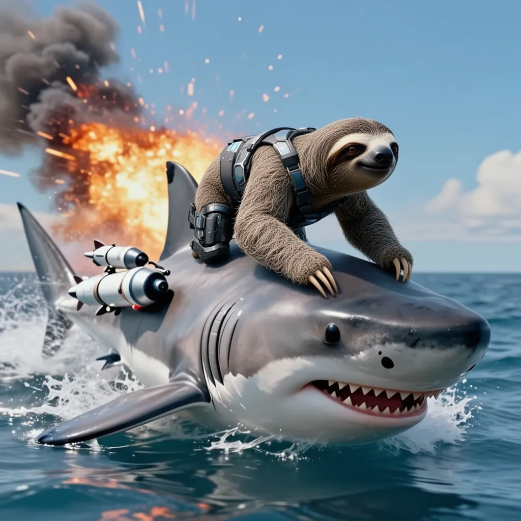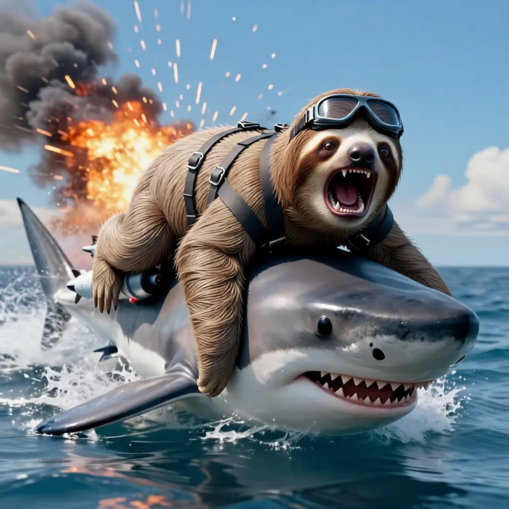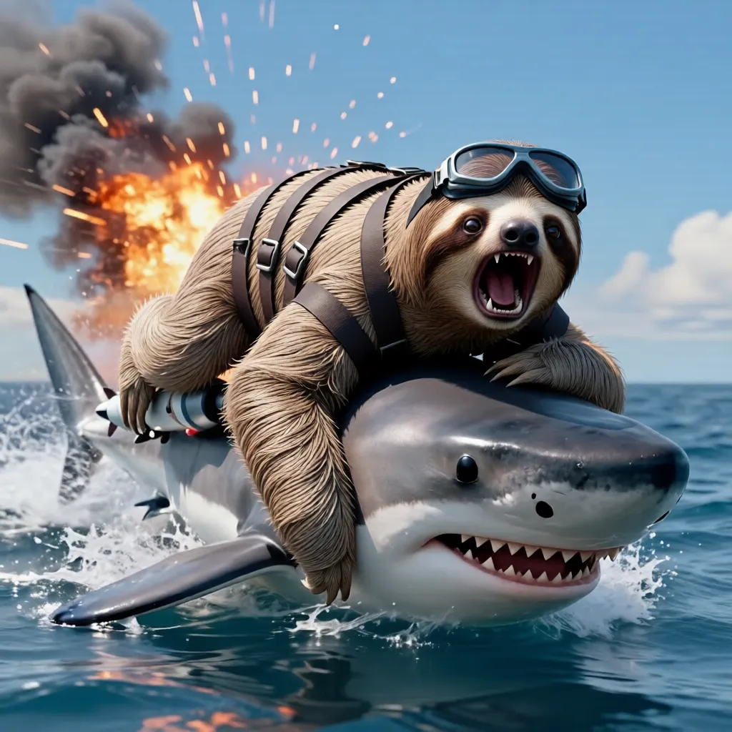 (reddish-colored fur:1.25) riding on the back of a fast-moving massive shark.