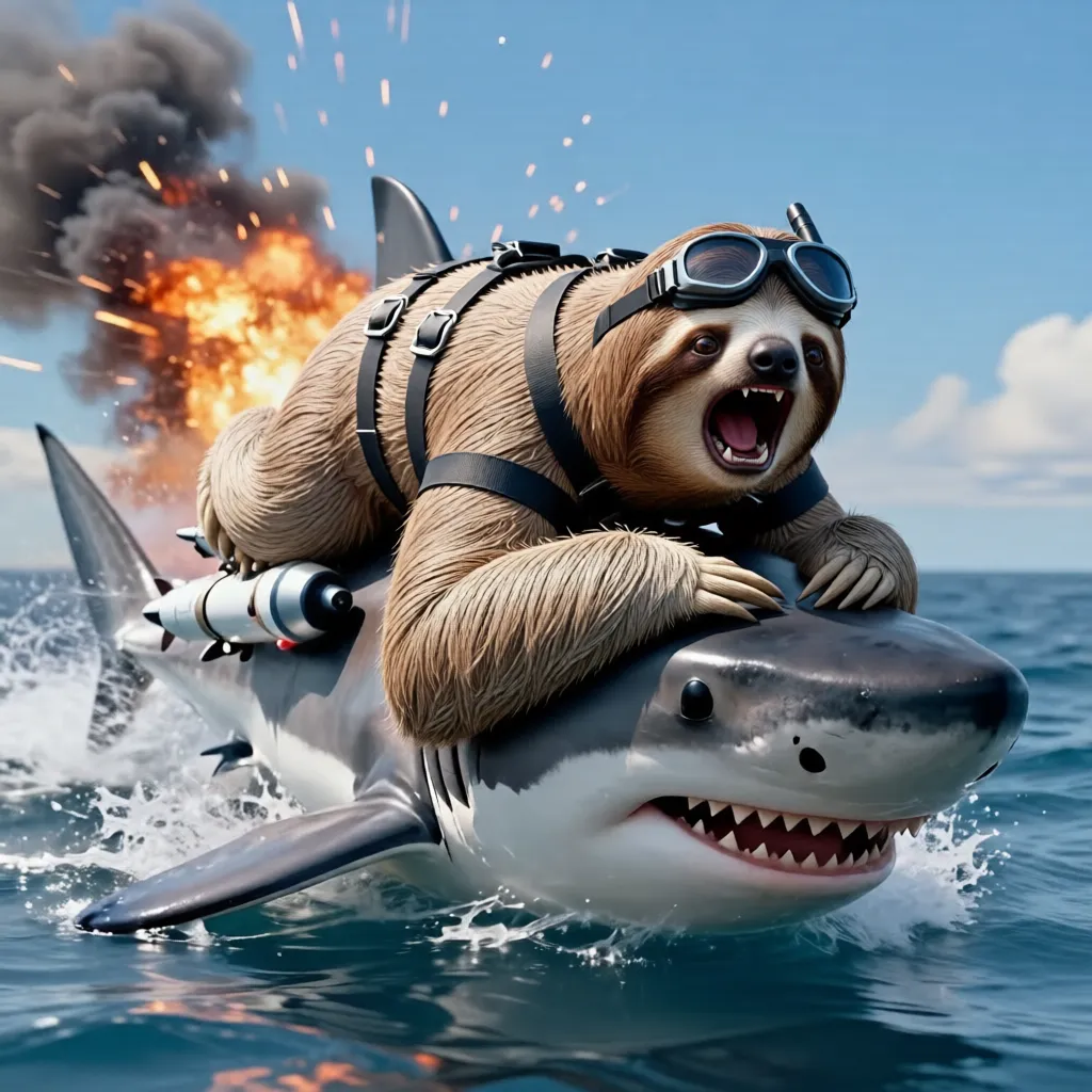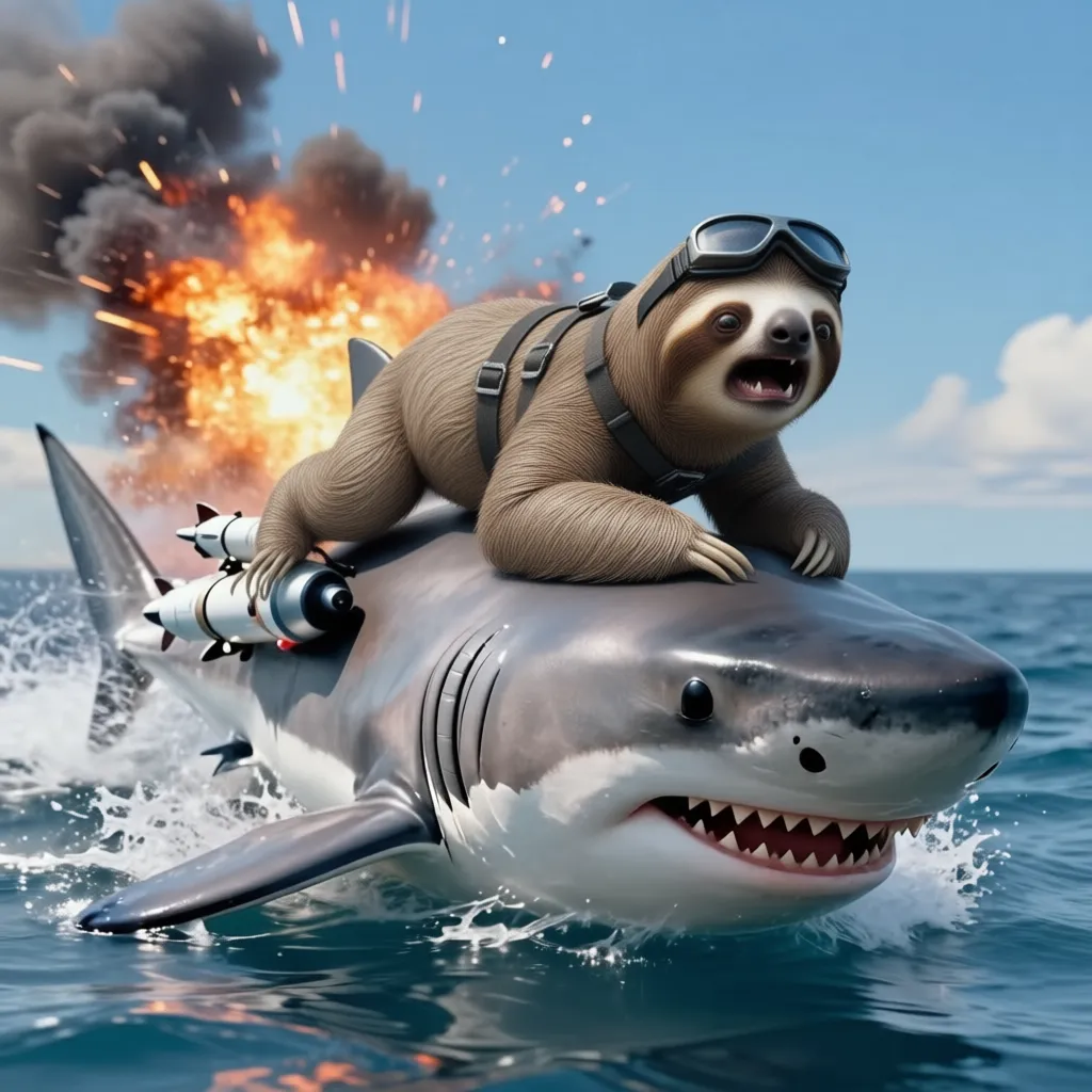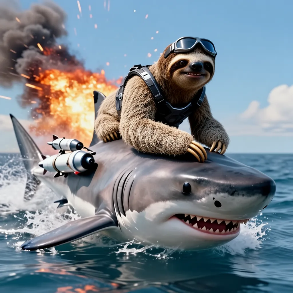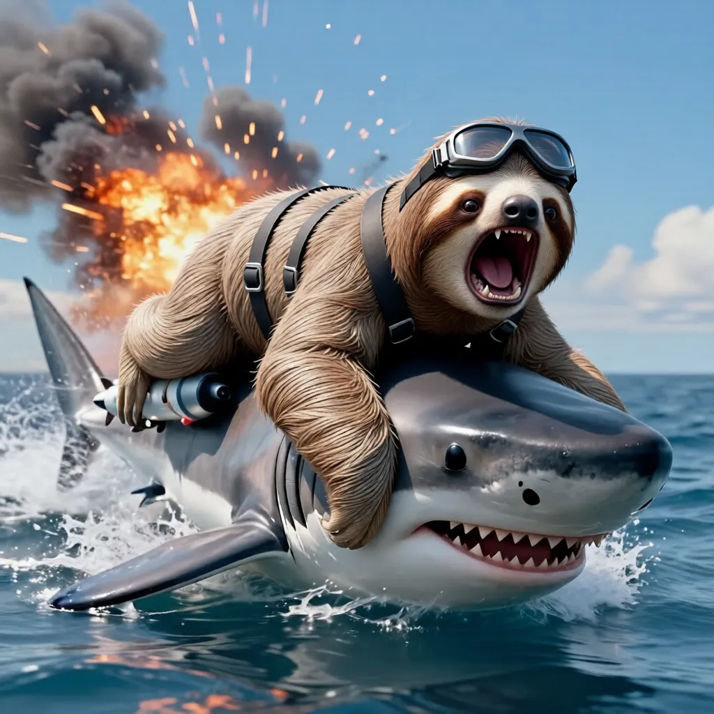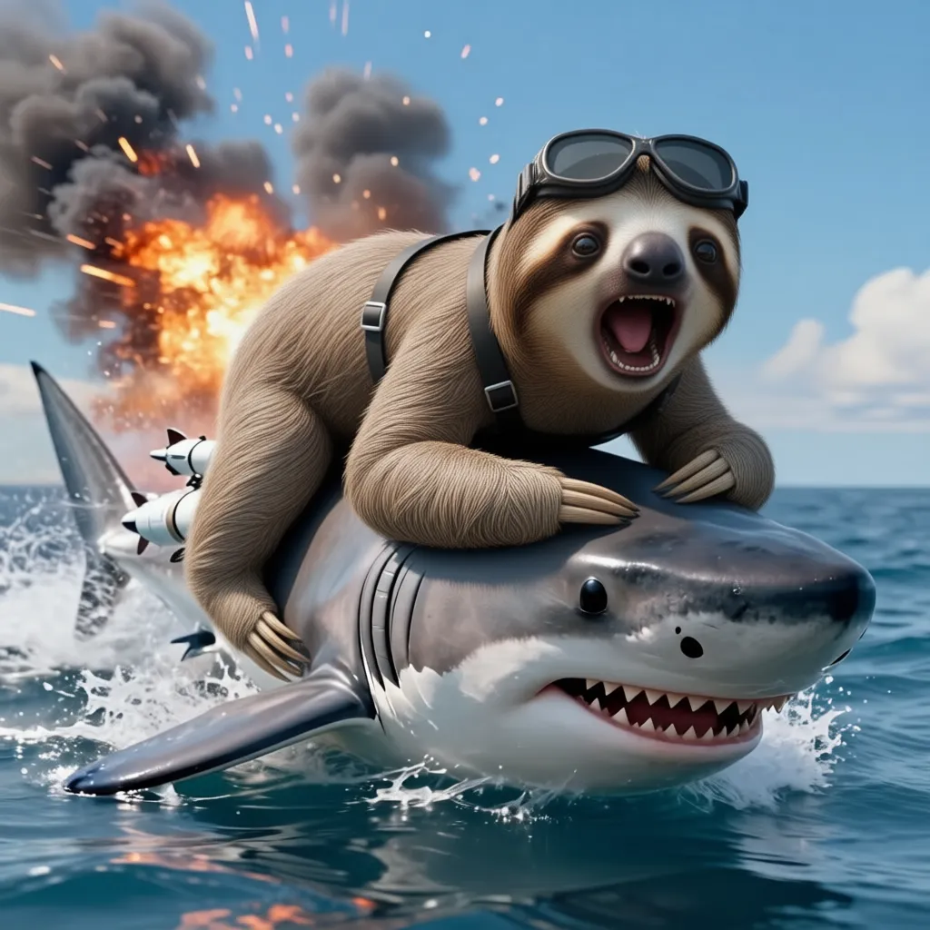 (reddish-colored fur:1.25) riding on the back of a fast-moving massive shark.