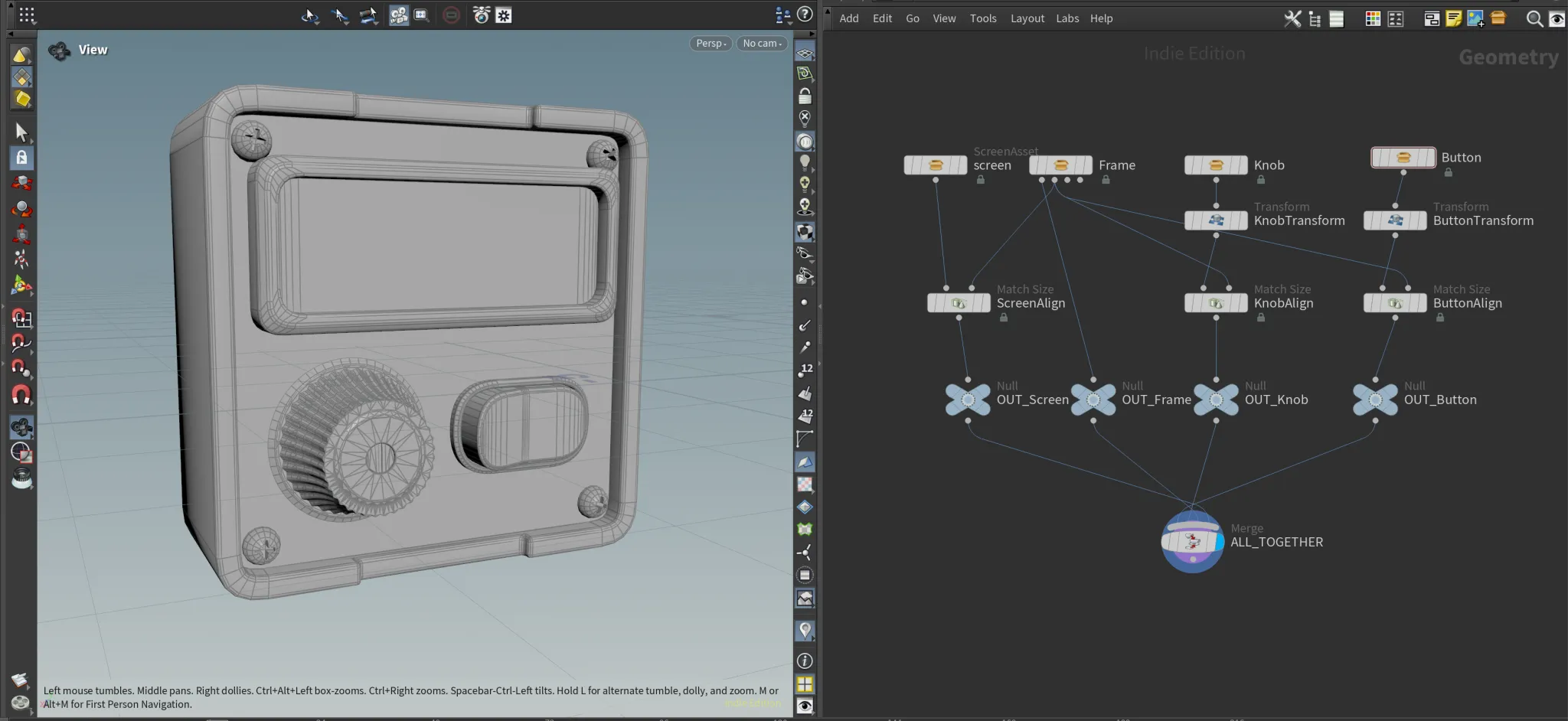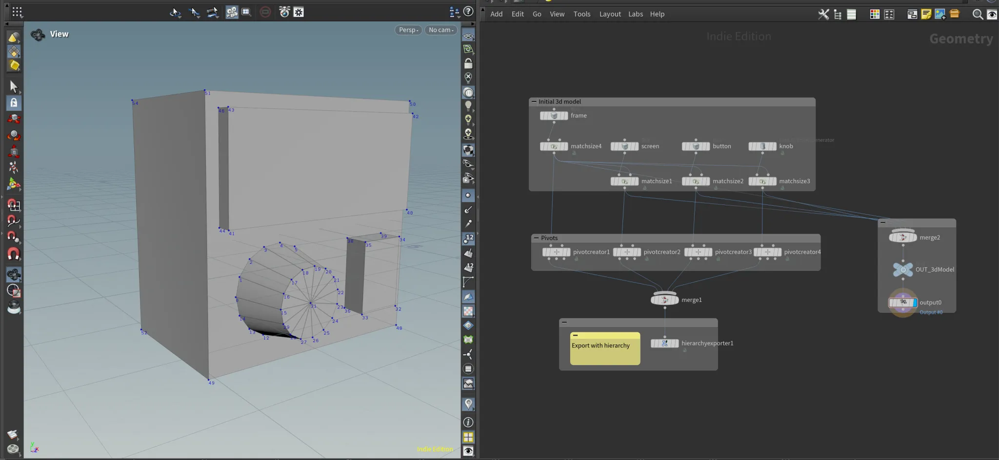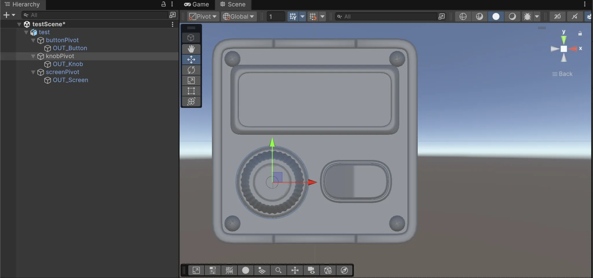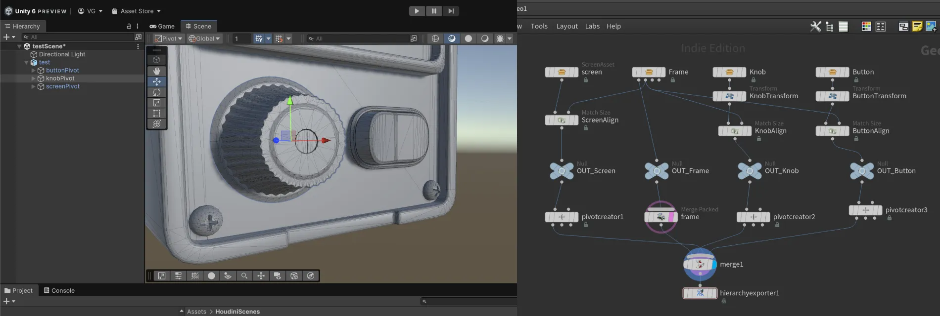 Let’s start with the following setup. We have a 3D model: the body of a small device, which includes a screen, a knob, and a switch button. All elements are placed on the device body using MatchSize nodes, which ensure the precise positioning of all elements on the front panel of the device. Houdini allows us to create fully parametric objects, but in this tutorial, we will focus on transferring the 3D model to the Unity engine and adjusting the pivots.