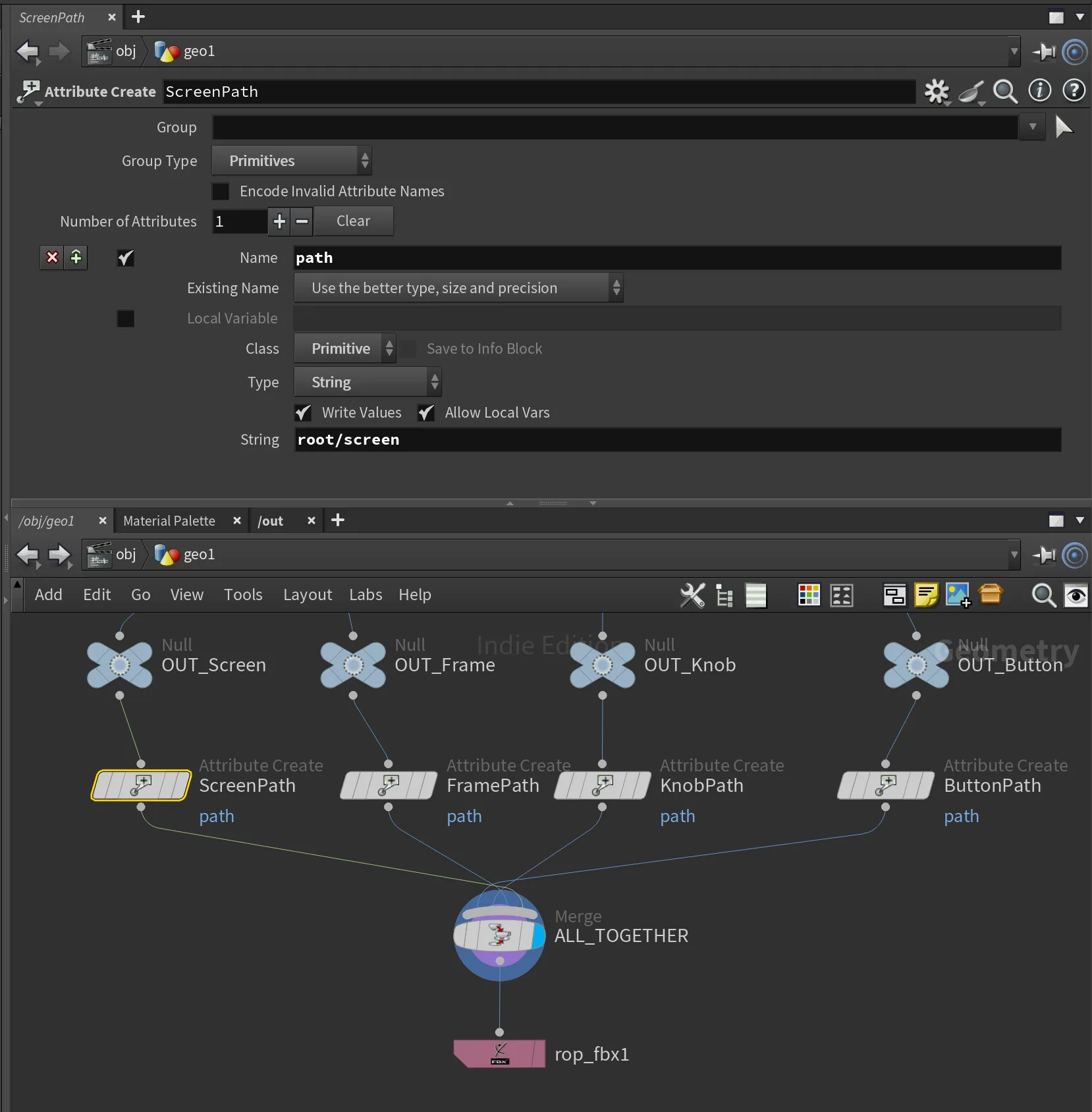 We will define these paths for each part. To do this, you can add an Attribute Create before each model, select string as the data type, and specify the paths as follows: