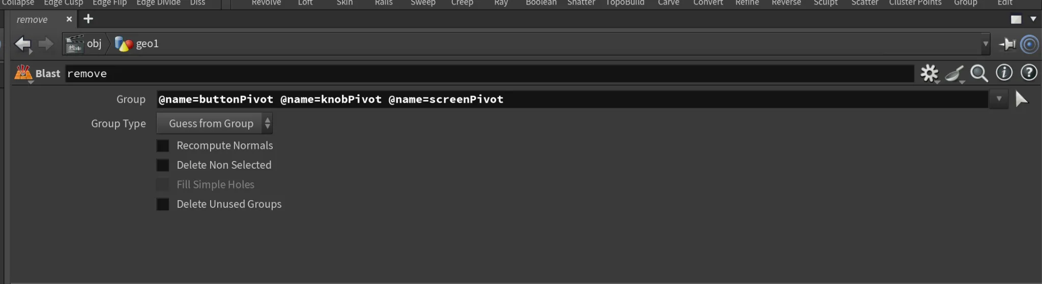 Next, add a Blast node to remove all unnecessary geometry (the pivots are points, but we don’t need them; we need an empty transform).